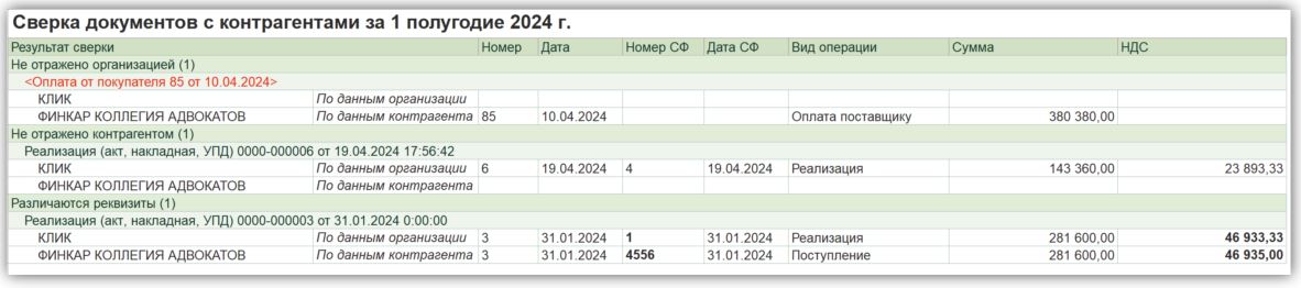 «1С:Сверка 2.0» в фоновом режиме получает данные, сверяет их и уведомляет вас о результатах – все хорошо или между документами есть расхождения. Наглядный отчет в программе 1С покажет пары документов с обнаруженными расхождениями: даты, номера документов, суммы и НДС. По каждому выявленному расхождению можно перейти в исходный документ для корректировки.